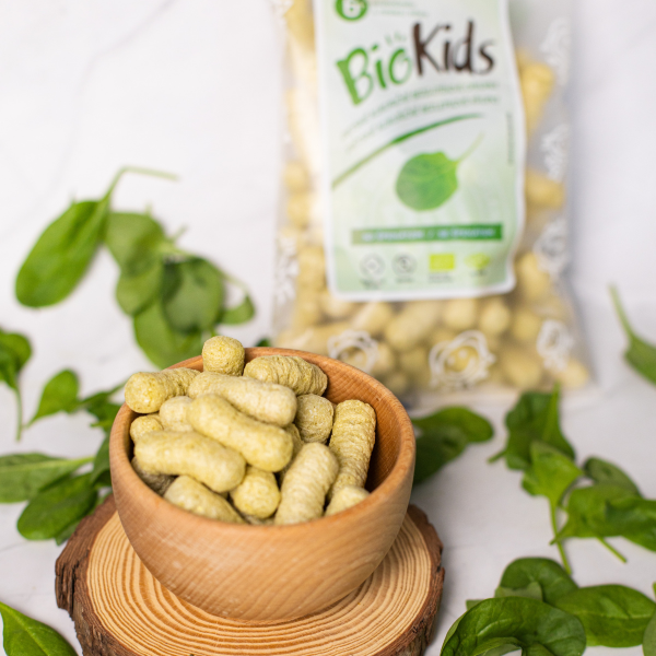 BioKIDS detské kukuričné chrumky so špenátom sú vyrobené z 92% kukurice (múka a/alebo krupica), 5% zemiakových vločiek a 3% dehydratovaného špenátu, všetko pochádza z kontrolovaného ekologického poľnohospodárstva. Pridaný vitamín B1 (tiamín) prispieva k správnemu fungovaniu organizmu. Pre svoju veľkosť sa dobre držia a okusujú aj deťom od ukončeného 6 mesiaca veku. Sú oveľa zdravšou variantou ako podávať deťom obľúbený klasický tukový rožok z bieleho pečiva, prípadne chrumky plné palmového oleja a trans mastných tukov.